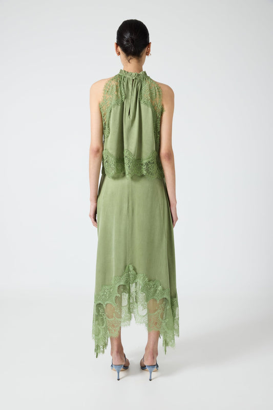 ZEPHIRA – Ensemble haut à col plissé et jupe trapèze à fente irrégulière en satin et dentelle